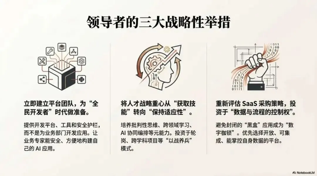 企业应着手建立或扩展内部的平台工程团队。团队职责不是为业务部门“开发应用”,而是为他们“提供开发平台”。团队需评估、集成并管理各种AI开发工具和模型,建立全公司的安全护栏、部署流水线和治理策略,目标是让不懂技术的业务专家,也能在安全合规的前提下,像使用Excel一样方便地构建自己的AI应用和自动化流程。