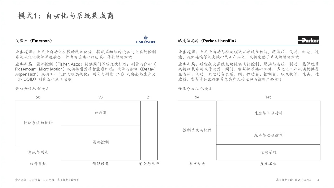 ▪ 艾默生 (Emerson) (年收入174.9亿美元,净利率11%) 是这一模式的典范。作为一家立足于自动化全栈技术优势的巨头,其战略精髓在于“将底层的智能设备与上层的控制系统及优化软件深度融合”。在其业务布局中,以Fisher、Asco等品牌为代表的最终控制业务 (阀门等物理执行端,收入占比33%) 是价值核心,与提供传感器等智能感知端的测量与分析业务 (收入占比23%) 、提供工厂大脑与顶层优化的软件与控制业务 (收入占比24%) 紧密结合,共同构成了一体化的解决方案,覆盖从感知、执行到控制与优化的完整闭环。