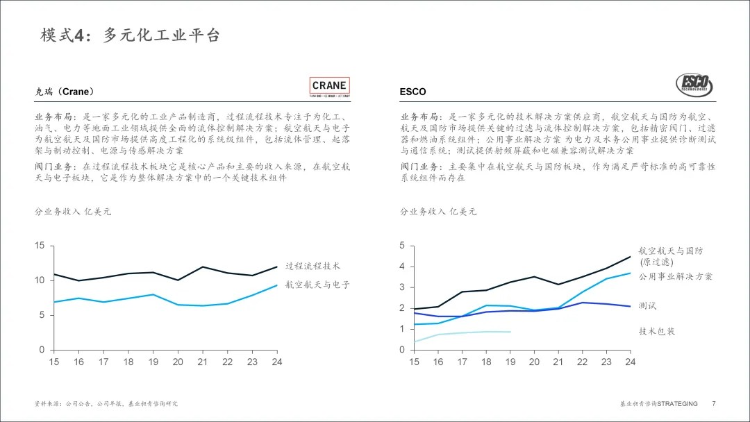 ▪ 克瑞 (Crane) (年收入21.3亿美元,净利率14%) 是一家多元化的工业产品制造商。其业务由过程流程技术和航空航天与电子两大板块构成。其中,过程流程技术板块 (2024年收入约12.0亿美元) 专注于为化工、油气等领域提供流体控制方案,是阀门业务的核心。同时,在航空航天与电子板块 (2024年收入约9.3亿美元) 中,阀门也是流体管理、起落架等系统中的关键技术组件,体现了阀门技术作为基石,支撑多个业务发展的平台特性。