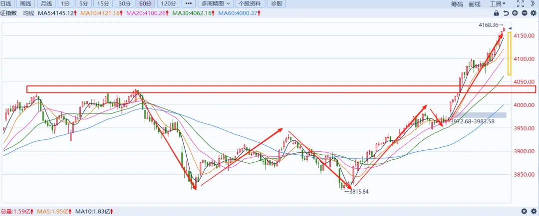 支撑:4119(今日低点+震荡中枢+短期情绪支撑,与5日均线、昨日收盘价共振强化,支撑有效性至关重要)、4120(预估5日均线+昨日收盘价支撑,与今日低点形成三重共振)、4085(预估30周均线支撑,中期重要防御位)、4050(中期核心支撑位,汇聚多条中长期均线与密集成交区)