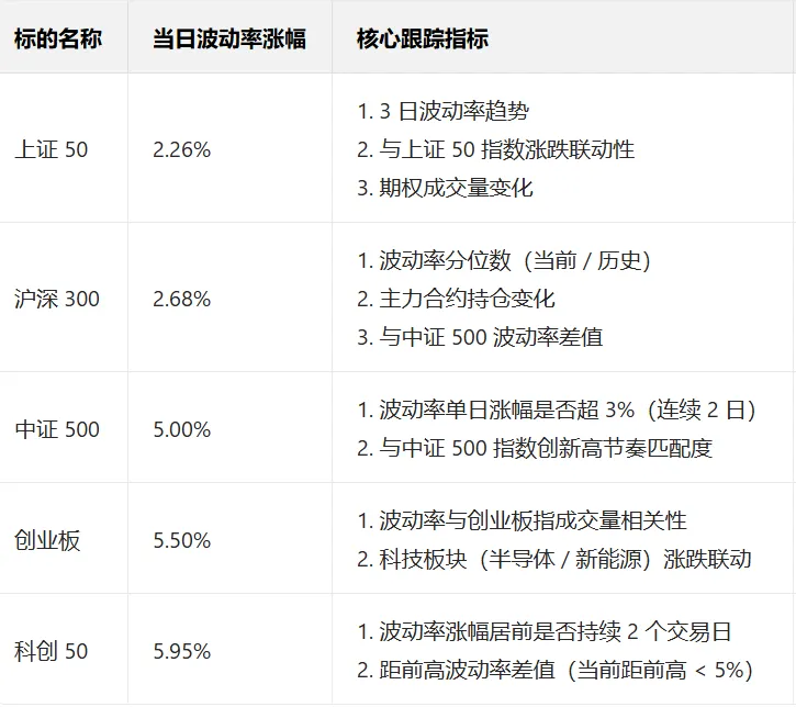 波动率集体攀升,反映出市场对后市波动预期显著升温。其中科创50与创业板波动率涨幅突出,与两大标的高弹性属性、资金博弈加剧直接相关。当前波指上行推动期权合约价格走高,对买方成本端形成压力。
