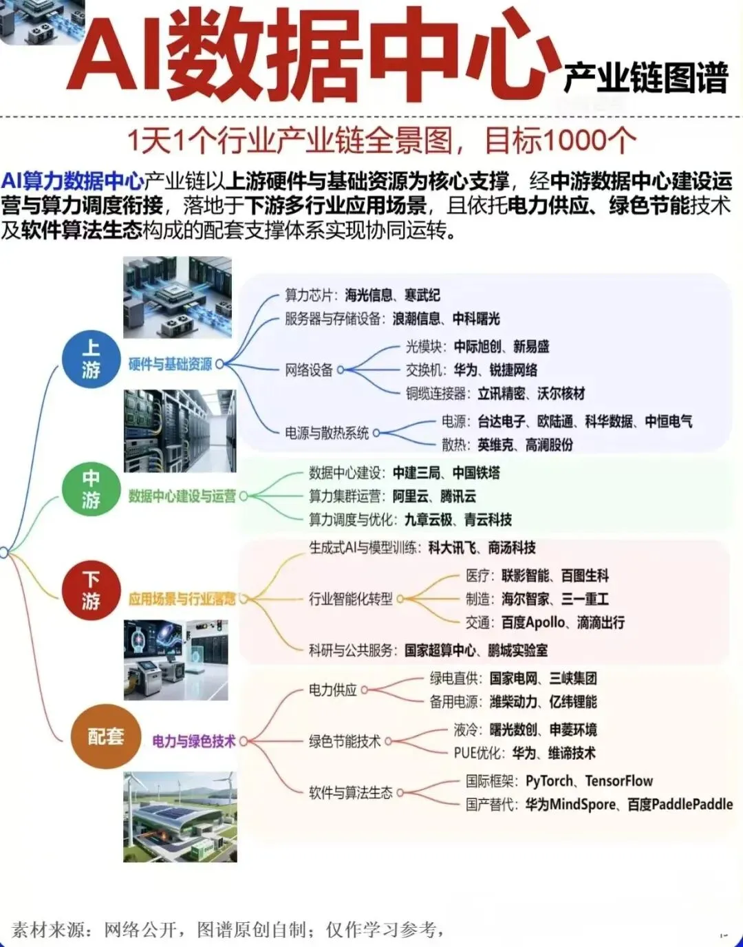 AI 算力数据中心作为数字经济时代的核心基础设施,是支撑人工智能、大数据、云计算等新一代信息技术发展的 “算力底座”。当前,全球 AI 算力需求呈指数级增长,带动产业链从上游硬件研发、中游建设运营到下游场景应用全面升级,产业正加速从 “规模扩张” 向 “质效并重” 的关键转型期迈进。我国 AI 算力数据产业链已形成完整布局,在上游核心硬件、中游算力调度、下游行业应用及配套支撑体系等环节均涌现出一批龙头企业,整体竞争力处于全球第一梯队。