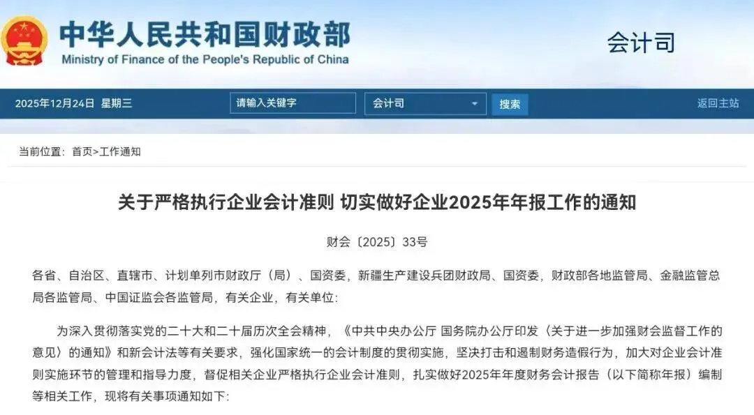 为深入贯彻落实党的二十大和二十届历次全会精神,《中共中央办公厅 国务院办公厅印发〈关于进一步加强财会监督工作的意见〉的通知》和新会计法等有关要求,强化国家统一的会计制度的贯彻实施,坚决打击和遏制财务造假行为,加大对企业会计准则实施环节的管理和指导力度,督促相关企业严格执行企业会计准则,扎实做好2025年年度财务会计报告(以下简称年报)编制等相关工作,现将有关事项通知如下: