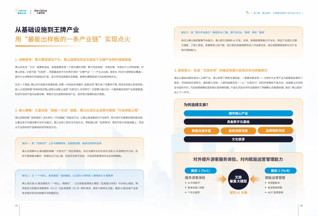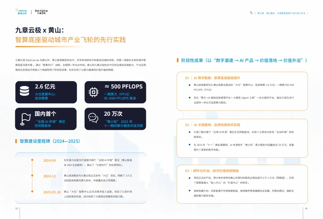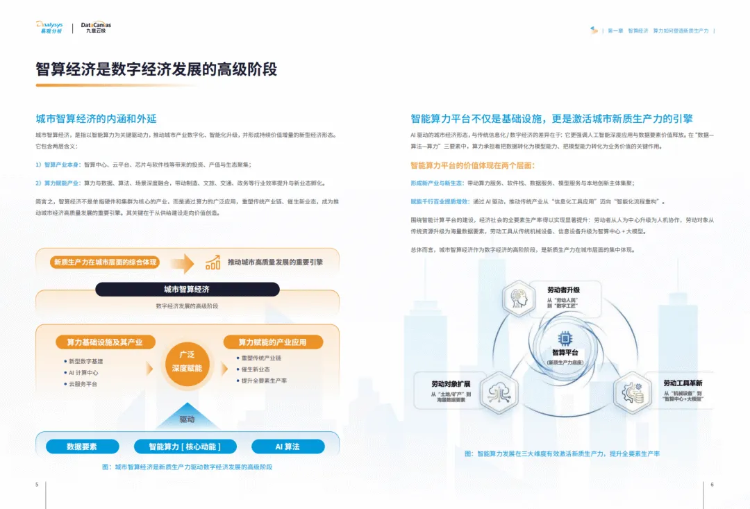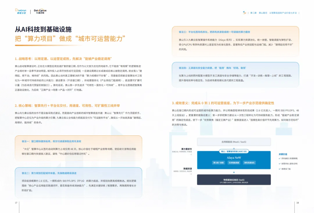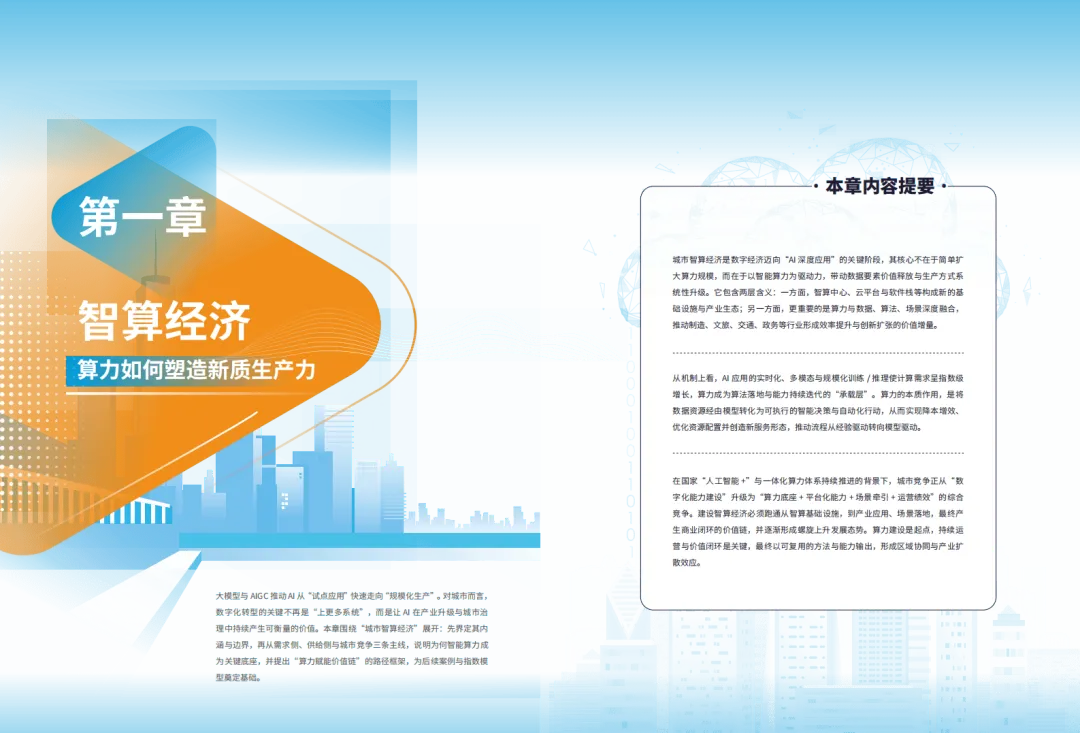 智算经济作为数字经济的高级阶段,已成为城市发展新质生产力的核心驱动力,在国家“人工智能+”行动与“东数西算”工程推动下,智能算力规模高速增长,截至2025年底全国AI算力总规模接近1000 EFLOPS,增速约65%,计算力指数每提高1个百分点,数字经济和GDP将分别增长约3.3‰和1.8‰。其核心是通过智算云平台整合算力、数据、算法与场景,形成“技术基建-产业切入-场景落地-商业闭环-生态辐射”的完整价值链,黄山实践提炼的“七步法”路径极具示范意义,通过快速建成“大位”智算中心(一期算力约500 PFLOPS),聚焦文旅王牌产业打造AI伴游等标杆场景,实现数据回流驱动产品迭代、收益反哺算力扩容的良性循环。多城实践呈现差异化路径,马鞍山以训练型智算底座撬动工业AI产业化,济南打造“高标准+强运营”区域智算高地,昆明构建面向南亚的绿色智算枢纽,均通过政企协同、平台化运营、场景化适配实现算力价值转化。未来智算将向普惠供给、垂直大模型渗透、治理动态化方向演进,不同类型城市需按基础设施起步型、场景零散型、局部闭环成熟型分类施策,通过多方共建机制推动智算经济规模化落地,为制造、文旅、政务等千行百业提质增效,持续赋能城市产业升级与高质量发展。