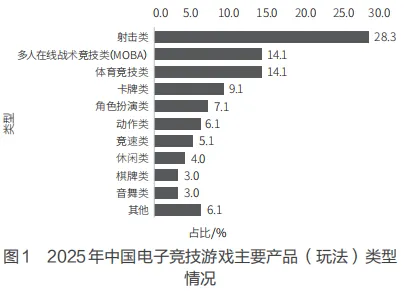 截至2025年12月,中国电子竞技游戏主要产品的玩法类型中,产品数量最多的3种类型是射击类、多人在线战术竞技类(MOBA)和体育类,占比分别为28.3%、14.1%和14.1%。如图1所示。