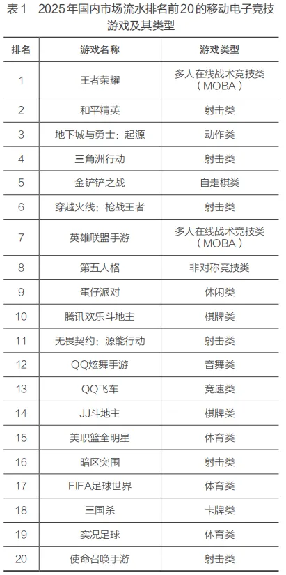 2025年,移动电子竞技游戏产品国内市场流水的前3名分别是《王者荣耀》《和平精英》和《地下城与勇士:起源》。移动电子竞技游戏产品国内市场流水排名前20的产品以射击类、体育类和棋牌类为主。如表1所示。