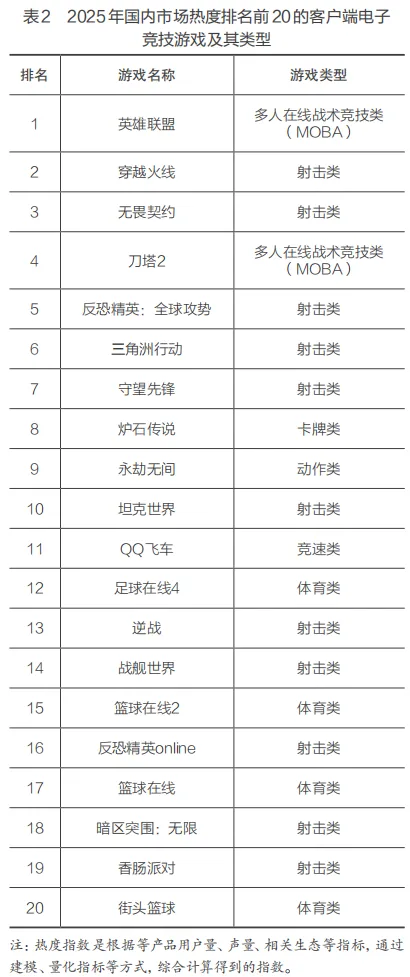 在客户端电子竞技游戏中,《英雄联盟》《穿越火线》和《无畏契约》占据国内市场热度前3名。客户端电子竞技游戏产品国内市场热度排名前20的产品以射击类为主。《三角洲行动》作为2024年才正式上线的电子竞技游戏,其移动端与客户端收入均表现不俗,成为近年电子竞技新品的代表之作。如表2所示。
