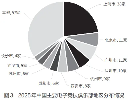 截至2025年,中国目前可查询的电子竞技俱乐部共有165家,拥有10家及以上电子竞技俱乐部的城市有上海、北京和广州。上海依然是拥有俱乐部数量最多的城市,达到38家。如图3所示。