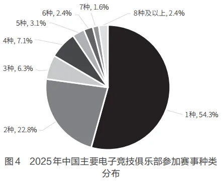大多数电子竞技俱乐部只参加单种赛事,占比为54.3%。另有相当一部分俱乐部参加2种赛事,占比为22.8%。其次为参加4种和3种赛事的俱乐部,占比分别7.1%和6.3%。如图4所示。