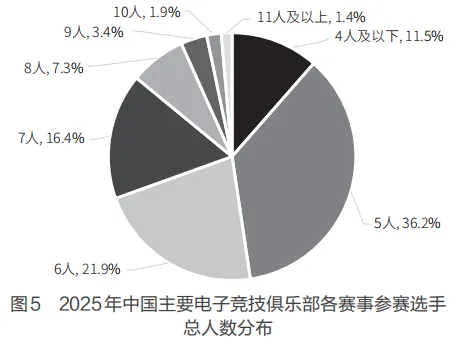 在中国主要电子竞技俱乐部各赛事参赛选手人数分布上,5人、6人和7人是最常见的3种俱乐部参赛选手规格,分别占比为36.2%、21.9%和16.4%。其他情况如图5所示。