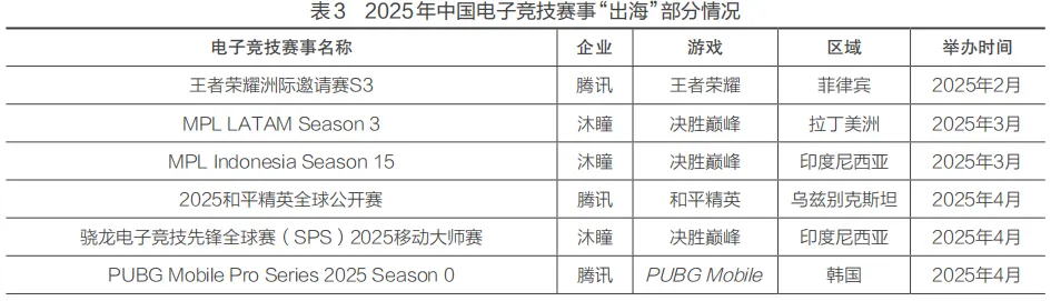 2025年,中国电子竞技产业持续深耕海外市场,进一步巩固了在东南亚、中东和拉丁美洲等国家的市场优势。如表3所示。