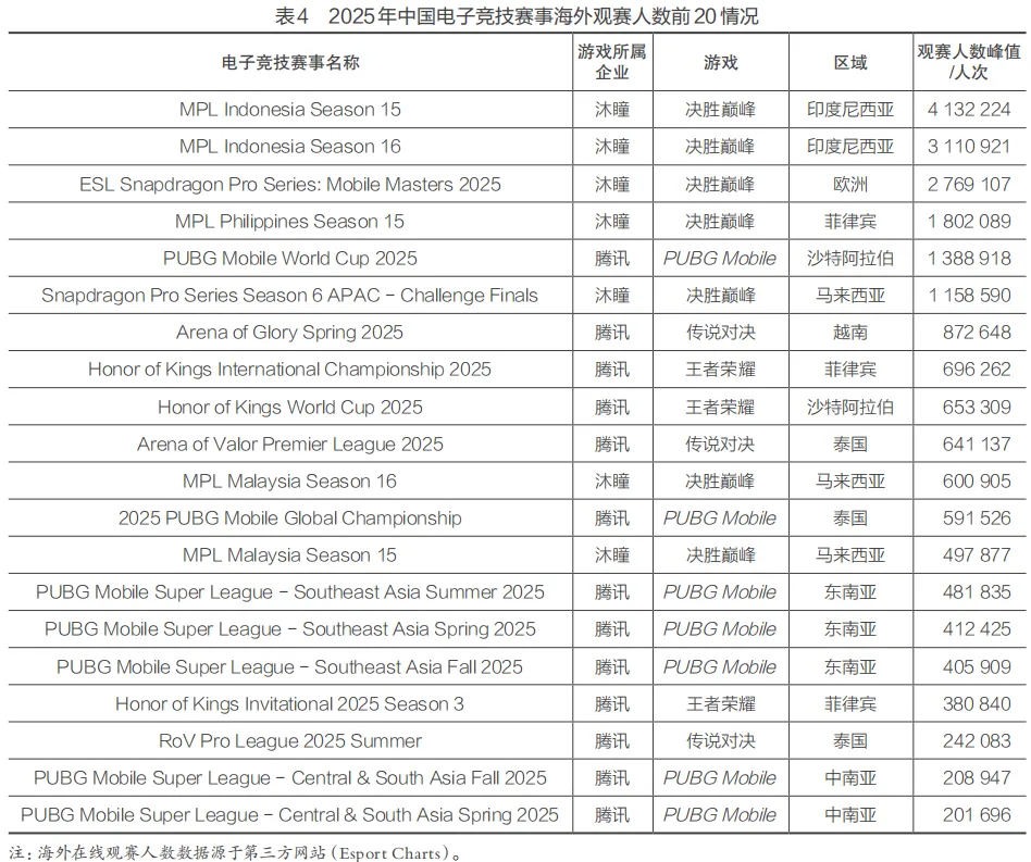 中国自主研发的电子竞技游戏赛事在海外蓬勃发展,吸引了超千万海外观众观看比赛。头部赛事的单场观赛人数峰值超过413万人次。如表4所示。