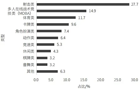 在电子竞技游戏产品类型方面,射击类、多人在线战术竞技类(MOBA)和体育类是最受青睐的游戏类型,分别占比28.3%、14.1%和14.1%。在电子竞技游戏平台方面,热门电子竞技产品大部分仅在移动端,占比为58.6%,较去年占比略有上升,代表游戏产品有《王者荣耀》《和平精英》和《地下城与勇士:起源》等;仅在客户端运营的产品占比25.3%,较去年占比略有下降,代表产品为《英雄联盟》《无畏契约》等。此外,同时在移动端和客户端运营的游戏产品占比12.1%,与去年占比很接近。