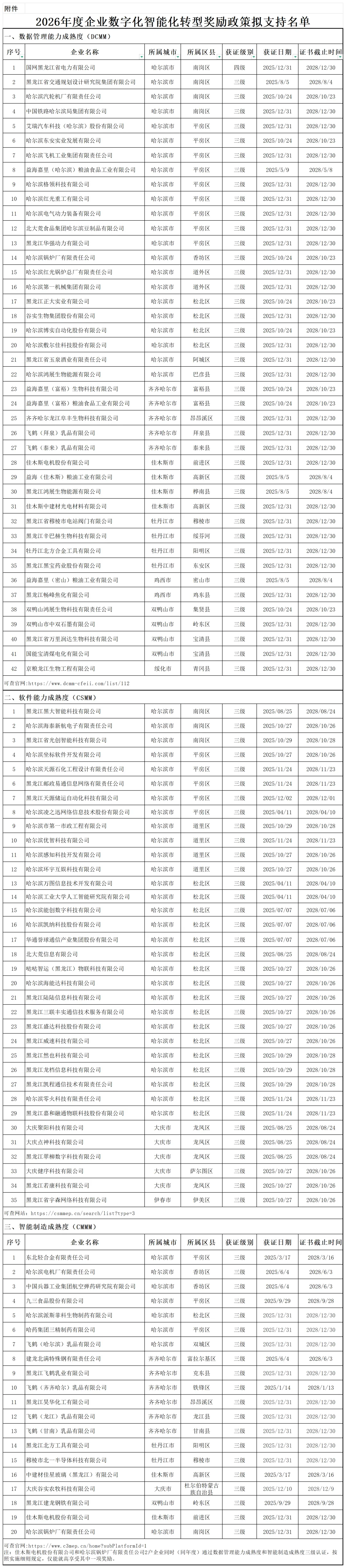 为贯彻落实《新时代龙江创新发展60条》(黑办发〔2023〕19号),依据《黑龙江省支持企业数字化智能化转型奖励政策实施细则》。按照公平、公正、公开的原则,现将符合“企业数字化智能化转型”免申即享类政策条件的拟支持名单予以公示,接受社会各界监督。公示期为2026年1月13日—1月19日(5个工作日)。如有异议,可在公示期内向省工信厅反映。