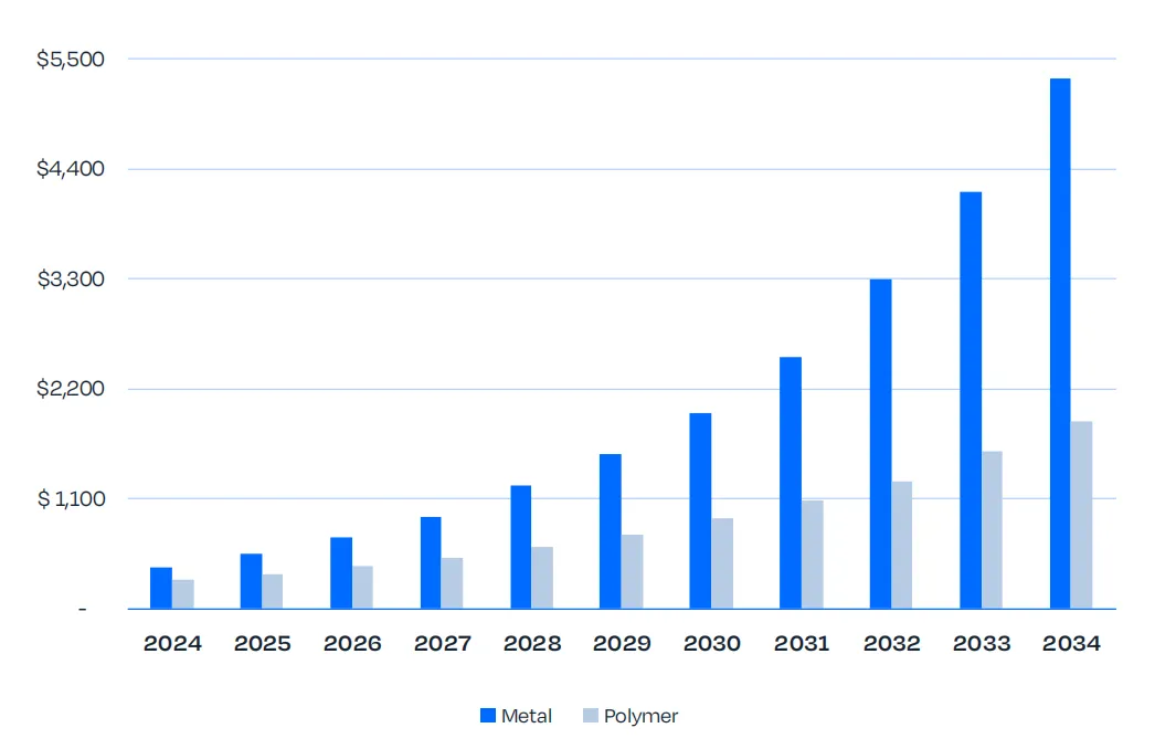 硬件市场的表现是技术能否持续落地的核心风向标。2023 至 2024 年,金属增材制造硬件营收从 2.02 亿美元增至 2.52 亿美元,涨幅 24.8%。这一数据反映出,多家资质认证中心及能源企业已开始投产工业级增材制造系统。从长期发展趋势来看,随着设备装机量扩大与产能利用率提升,该领域将迎来复合增长。按照 23.6% 的年复合增长率测算,到 2034 年金属增材制造硬件市场规模预计将达到 21 亿美元。