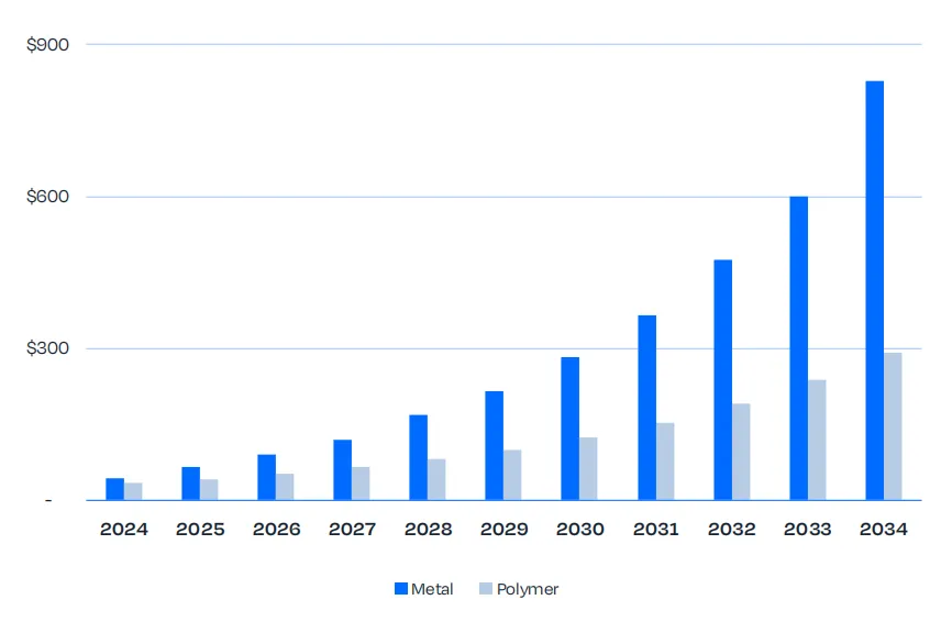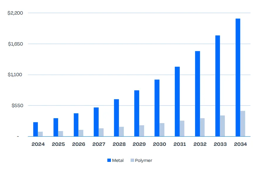 与此同时,材料消耗规模的增长速度更快,这也是规模化量产启动的信号。2024 年,金属增材制造材料营收同比增长 48.5%,达到 4400 万美元;基于 34.2% 的年复合增长率,预计到 2034 年这一数值将增至 8.29 亿美元。这一增长趋势与高温、耐腐蚀工况下,合格高温合金及不锈钢材料的用量攀升相吻合。