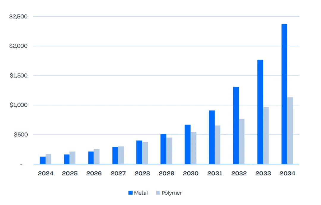 2024 - 2034 年能源领域聚合物与金属增材制造材料市场总收入预测(单位:百万美元)。