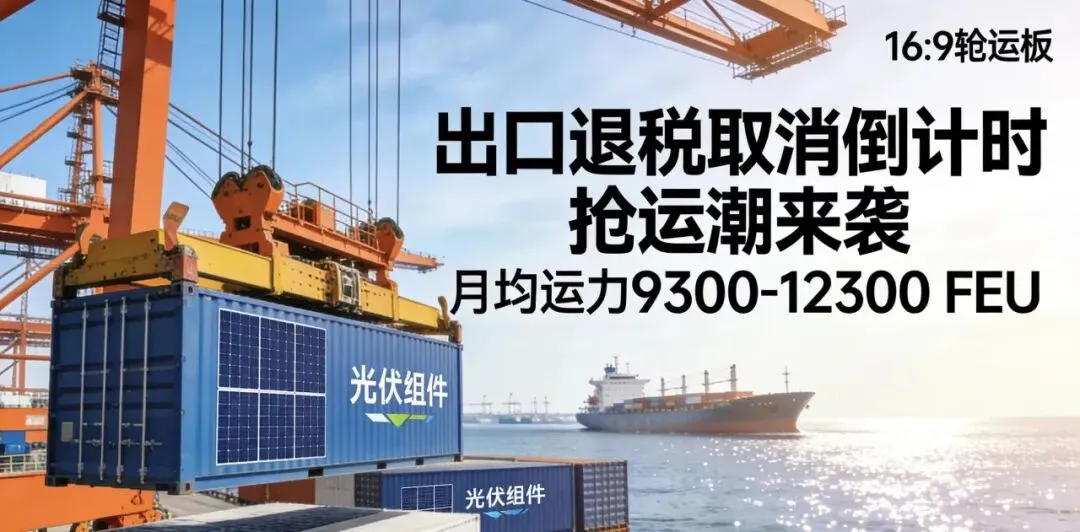2026年4月1日起光伏出口退税取消(从9%降至0),直接导致每块210R组件出口利润减少46-51元,企业毛利率面临压缩 。市场已启动短期抢运:国内工厂取消休假、全员加班赶工,欧洲、印度方向询价量激增,预计春节后每月抢运规模达9300-12300 FEU,相当于1-2艘超大型集装箱船运力。