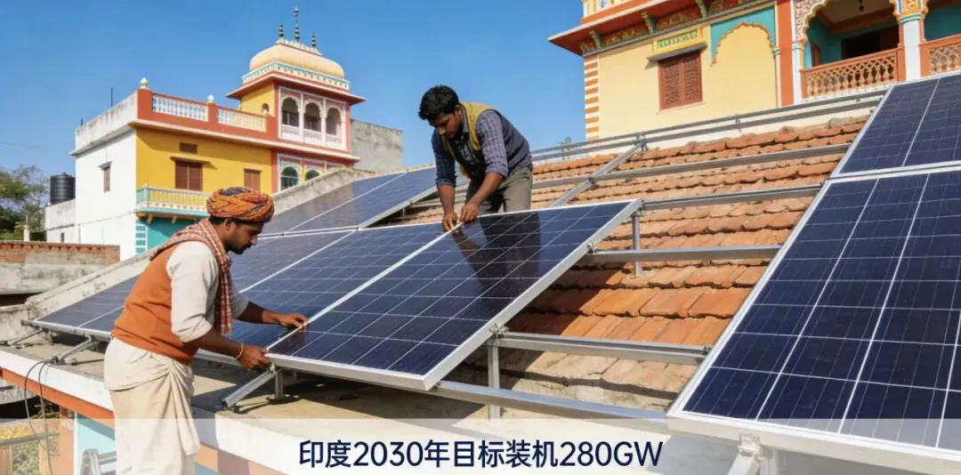 印度市场正以政策红利驱动爆发式增长:2024年新增装机24.5GW,同比翻倍,累计装机达97.9GW;总理光伏家庭计划(PM-SuryaGhar)、农民能源安全与发展计划(PM-KUSUM)等政策叠加,目标2026财年前新增84.8GW装机,2030年累计装机达280GW。