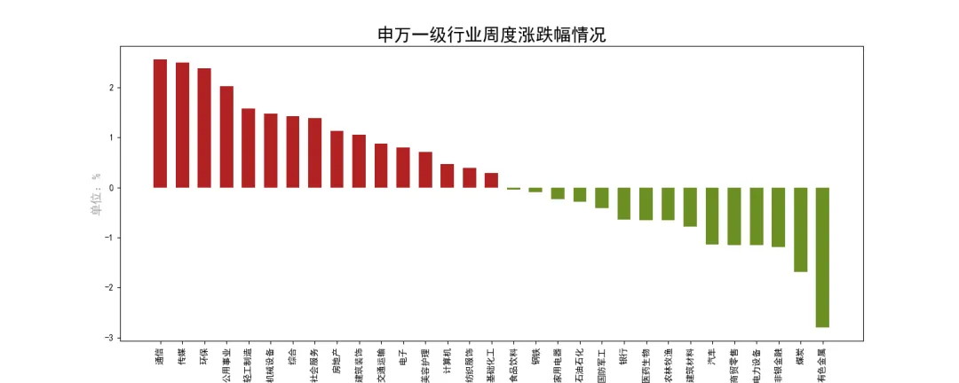 全周上证指数-0.08%,深成指-0.64%,创业板指数-1.35%。盘面通信、传媒、环保、公用事业和轻工制造等涨幅居前,有色金属、煤炭、非银金融。电力设备和商贸零售等表现较差。