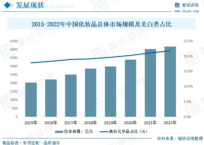 人们追求美丽的天性使化妆品市场始终保持长盛不衰,但随着时代发展和环境改变,产业竞争特点已出现较大变化,尤其是金融危机后,大众消费形态需求开始转变,消费者开始倾向“大众精品” (Masstige) ,即选择具备高价精品的品质,同时价格并不过分昂贵的“中档偏高”品牌,目前国内化妆品市场份额仍主要跨国集团占据,随着国内美容需求持续增长,整体化妆品市场规模快速增长,数据显示,截止2022年我国化妆品市场规模达4175.6亿元,较2021年小幅度增长3.7%,增速需求波动下降明显,其中美白类化妆品产品占比21.83%。