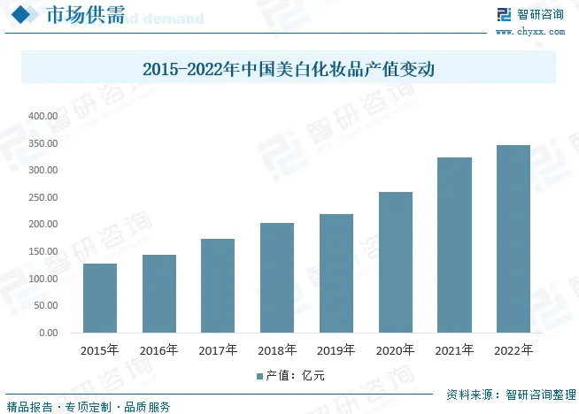 随着化妆品的主流消费者日本以及欧美地区的消费者消费理念逐渐发生变化,更加偏向于无刺激、副作用小的天然美白成分。绿色天然概念在原料市场上的流行,再加上科技进步带来的成本降低,使得化妆品企业在采购原材料时也会更倾向于这些产品,制造出的化妆品成品自然也少不了打上“绿色”“天然”的标识,相较传统化妆品,使用天然成分的化妆品整体原料成本更高,带动我国美白化妆品产值快速提升,截止2022年我国美白化妆品产值约348.6亿元,较2021年增长7.4%左右。