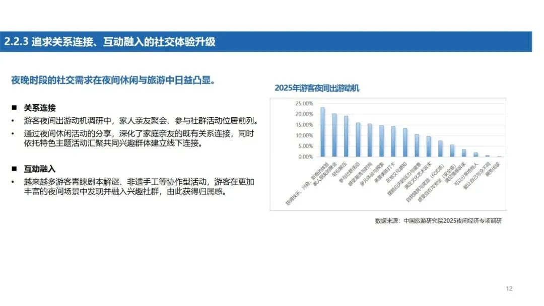 #夜间经济 已从城市生活的补充形态,演进为驱动消费、塑造文化品牌与提升城市活力的战略性载体。根据最新研究,中国夜间经济发展正迈入系统性扩容与结构性升级的新阶段,其核心逻辑已超越早期的照明保障与生活配套,转向由文化引领、科技赋能与精细化治理共同驱动的高质量发展。游客需求呈现显著的多元、求新、社交特征,对深度文化体验、高互动性场景及#情绪价值 的追求日益强烈。