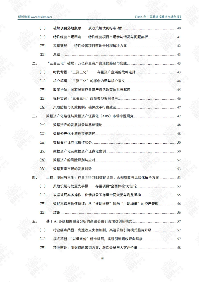 行业热点聚焦创新领域,数据驱动成为核心动能,AI技术赋能高速公路引流增收、城市停车优化等场景;“三资三化”改革推动万亿存量资产盘活;低空经济作为新兴赛道,成为地方政府与国企转型的重要方向;数据资产化与证券化(ABS)加速落地,为市场注入新活力。