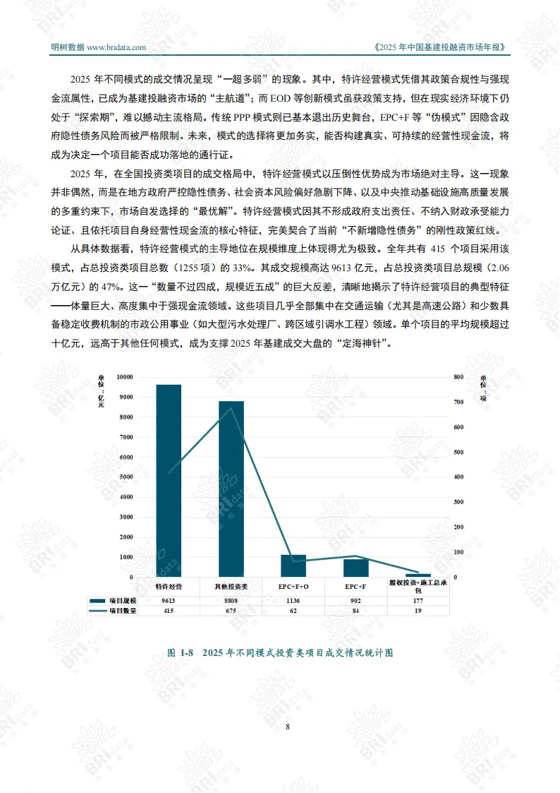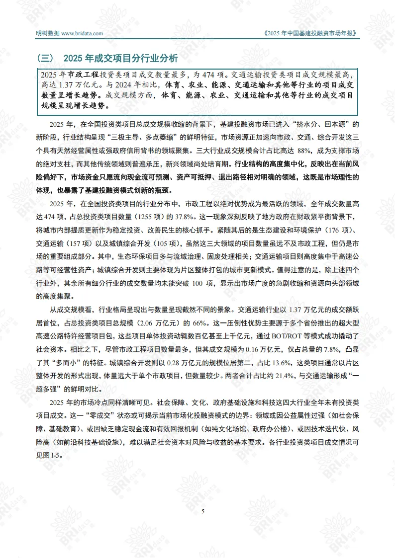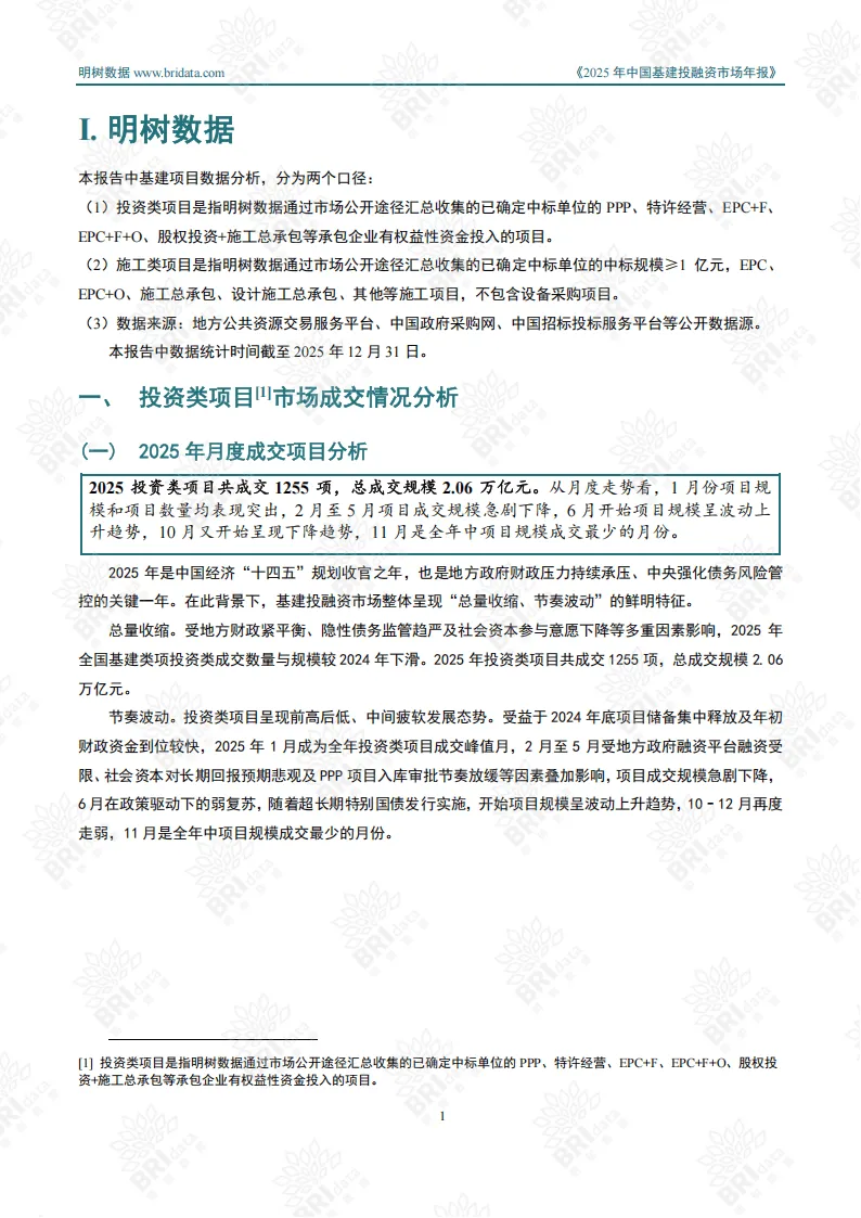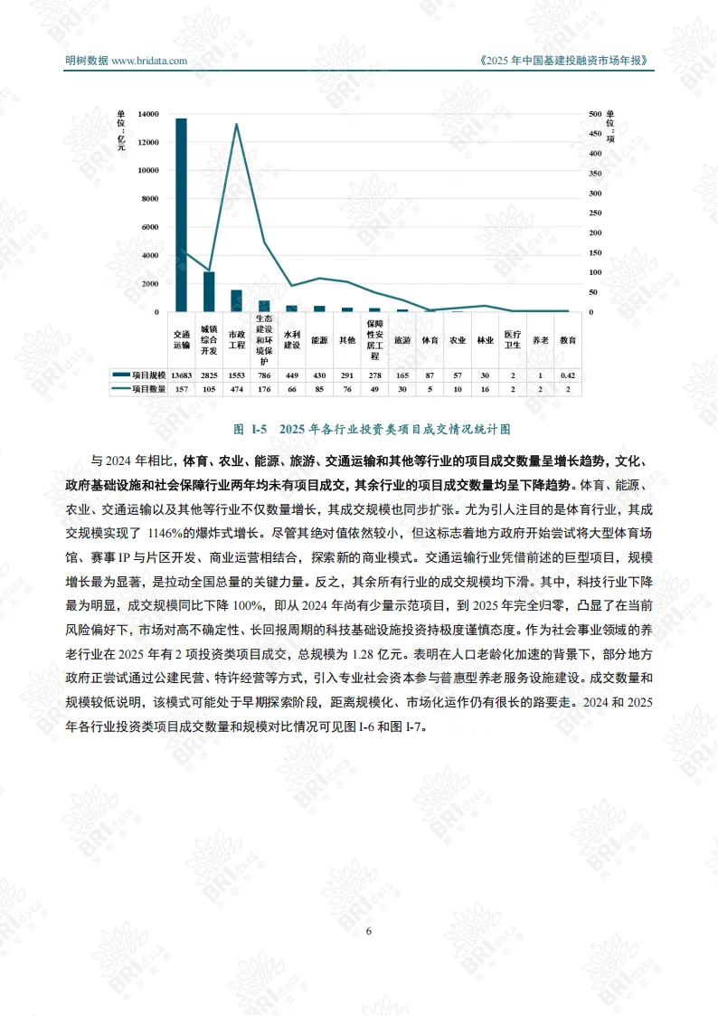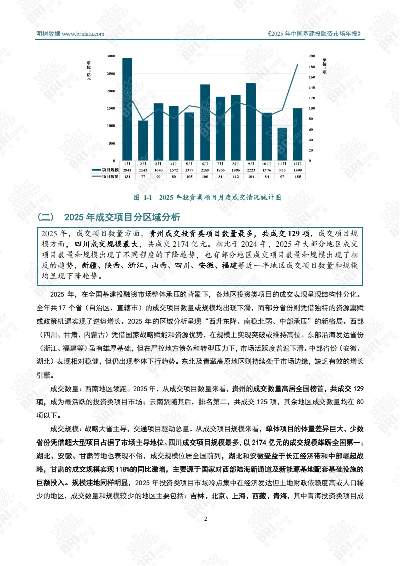 2025年中国基建投融资市场迈入“规模收缩、质量提升”的深度转型期,宏观经济调整、政策导向升级与技术创新迭代共同推动行业从规模扩张向质效优先转变。全年市场呈现区域分化、行业聚焦、模式转型的鲜明特征,投资类与施工类项目协同支撑市场稳定运行。