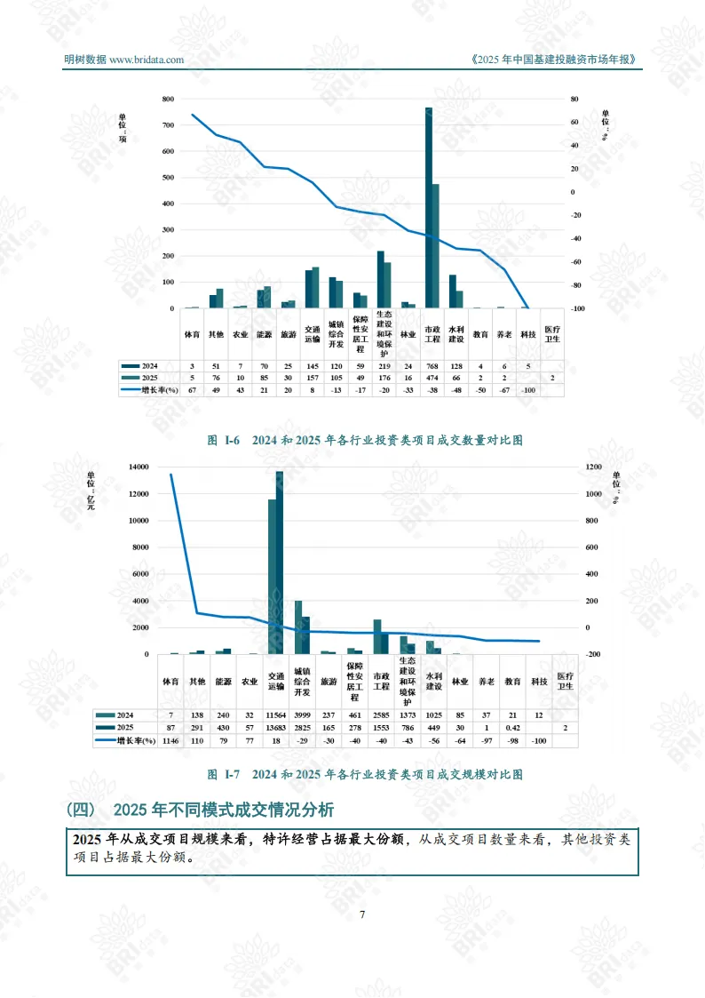 投资类项目全年成交1255项,总规模2.06万亿元,特许经营模式凭借市场化优势成为主流,占成交规模的47%。区域上呈现“西升东降”格局,四川以2174亿元成交规模居首,贵州项目数量最多。行业分布集中于交通运输、市政工程和城镇综合开发三大领域,合计占比超八成,其中交通运输领域以1.37万亿元规模领跑。社会资本中,国有企业占绝对主导,成交规模占比95.49%,地方国企成为项目实施主力军。