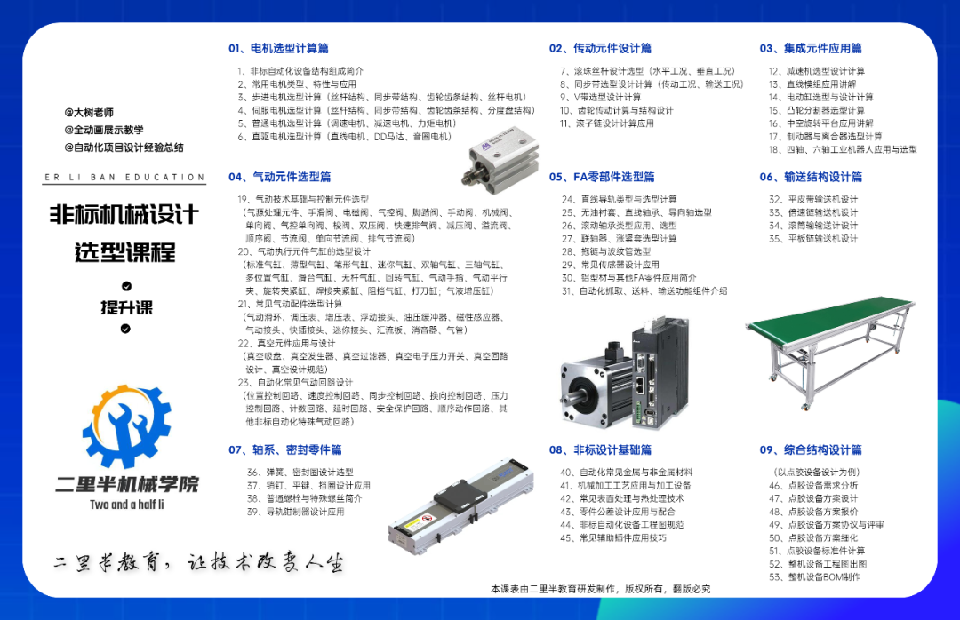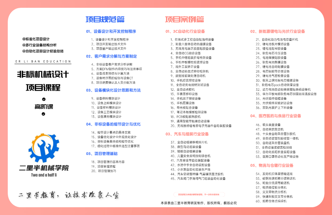 非标机械设计——项目课程,带领学员从0到1,真正掌握设备设计开发的要点。揉合了各行业的设备设计规范,把每个行业的设备具体方案拿出来分析,典型的结构做重点讲解,快速拓荒学员的方案设计视野。