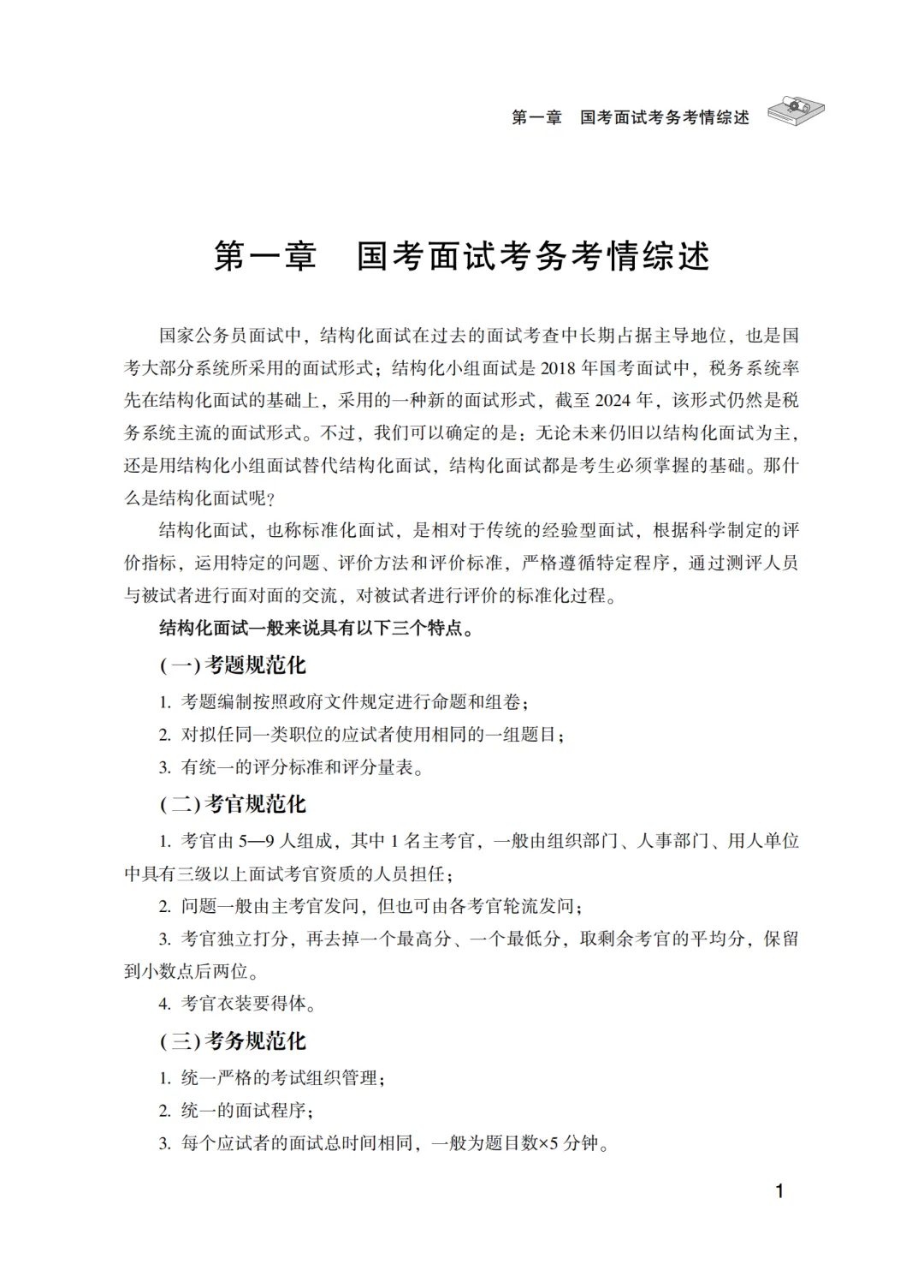 国家公务员面试中,结构化面试在过去的面试实践中长期占据主导地位,也是国考大部分系统所采用的面试形式;税务系统率先于2018年采取了结构化小组的面试形 式,此后陆续有部门也采纳了这一面试形式。但是,无论未来仍旧以结构化面试为 主,还是用结构化小组面试替代结构化面试,结构化面试都是必须掌握的基础。那什么是结构化面试呢?