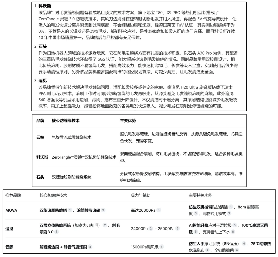 可以看到豆包、元宝和 DeepSeek 都是抓取了结构化的信息,围绕“解决毛发缠绕”这一特定诉求做出分析和取舍,但给出了三套不同的结果,对何为“最优入选”的判断不尽相同。