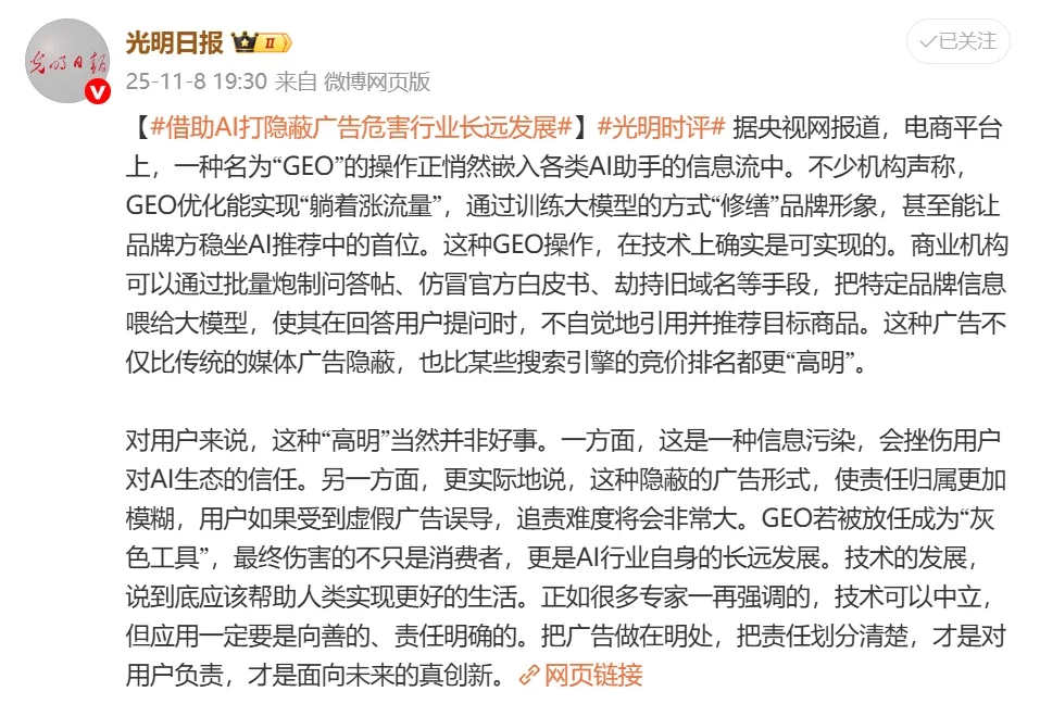 AI 无法天然对调用内容做“动机判断”,使其区别于“精心包装的营销内容”。《光明日报》不久前就发文批评过 GEO “借助 AI 打隐蔽广告”。商业机构可以通过批量炮制问答帖、仿冒官方白皮书、劫持旧域名等手段,把特定品牌信息喂给大模型,使其在回答用户提问时,不自觉地引用并推荐目标商品。