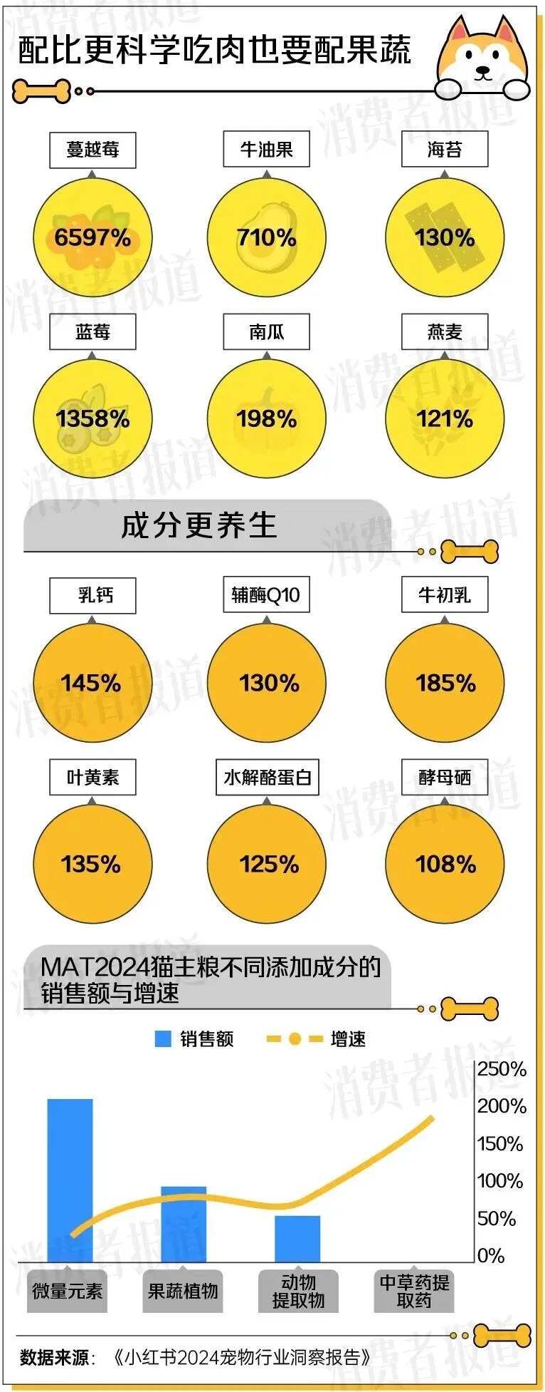 消费重点也特别明确:食品绝对是刚需,占每月消费的 44.7%。现在谁还敢随便喂啊,都讲究科学喂养,含蔓越莓、蓝莓这些天然果蔬,还有叶黄素、辅酶 Q10 这些营养成分的主粮卖得爆好,冻干、鱼油这些保健品销量直接暴涨好几倍,毛孩子的口粮比人吃得还精致!