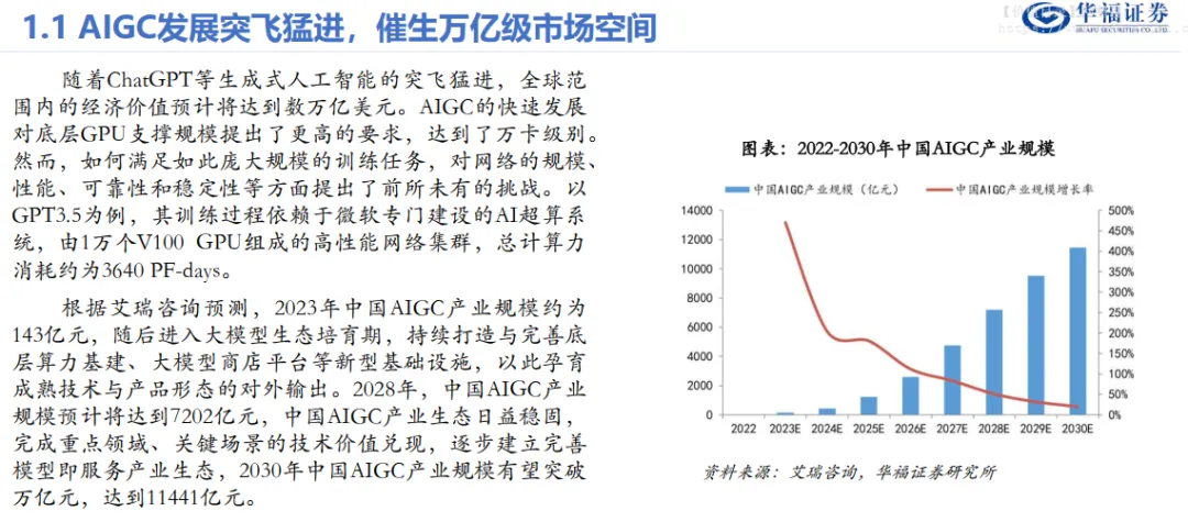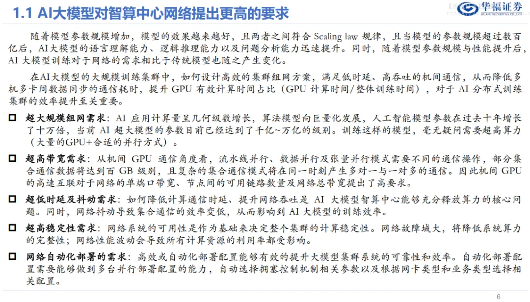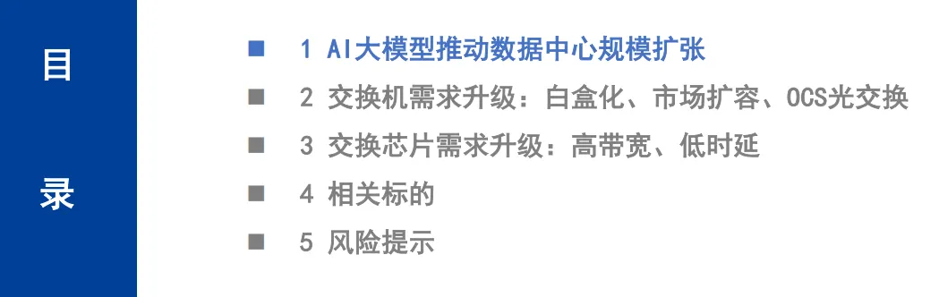►AI大模型进展,推动高带宽交换芯片应用。从近期密集的新闻发布来看,万卡规模AI大模型陆续推出,十万卡以及更大规模的模型也已经离我们很近了。智算中心网络无疑成为大家关注的重点,网络带宽和低延迟已成为大规模组网的关键瓶颈。