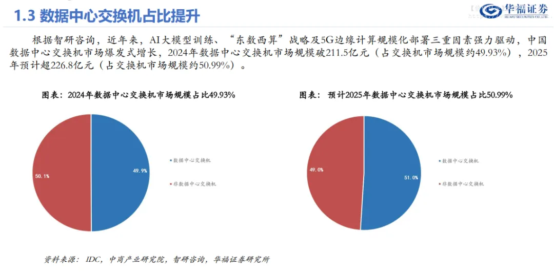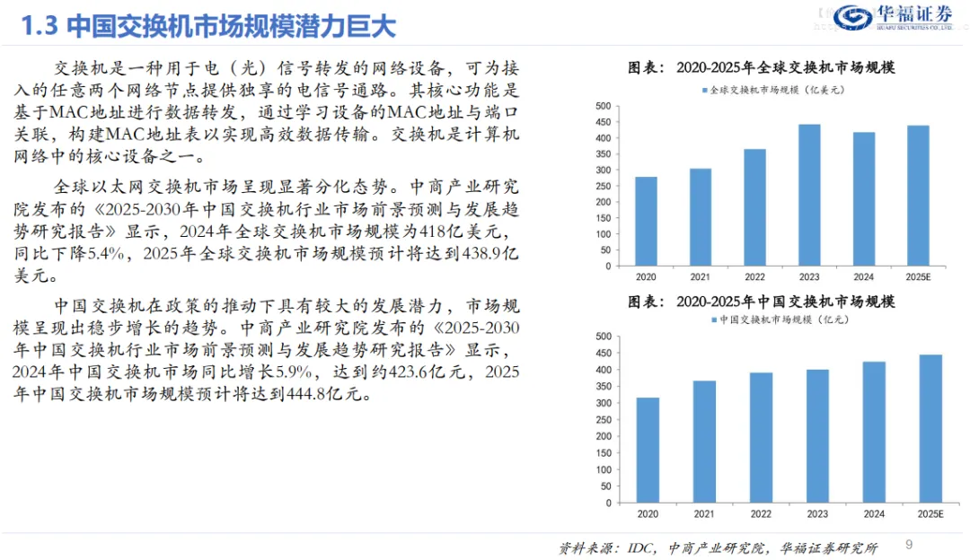 ►随着AI大模型的发展,大规模训练集群对网络提出更高的要求。①超大规模组网需求,②超高带宽需求,③超低时延及抖动需求,④超高稳定性需求,⑤网络自动化部署的需求。数据中心作为数字化时代的核心基础设施,通过集成计算、存储和网络资源,支撑着云计算、大数据和人工智能等技术的落地应用。当前数据中心正向智能化运维、算力网络融合和安全性强化方向深度发展。交换机是计算机网络中的核心设备之一。中商产业研究院发布的《2025-2030年中国交换机行业市场前景预测与发展趋势研究报告》显示,2024年全球交换机市场规模为418亿美元,同比下降5.4%,2025年全球交换机市场规模预计将达到438.9亿美元。而2024年中国交换机市场同比增长5.9%,达到约423.6亿元,2025年中国交换机市场规模预计将达到444.8亿元,具有较高发展潜力。