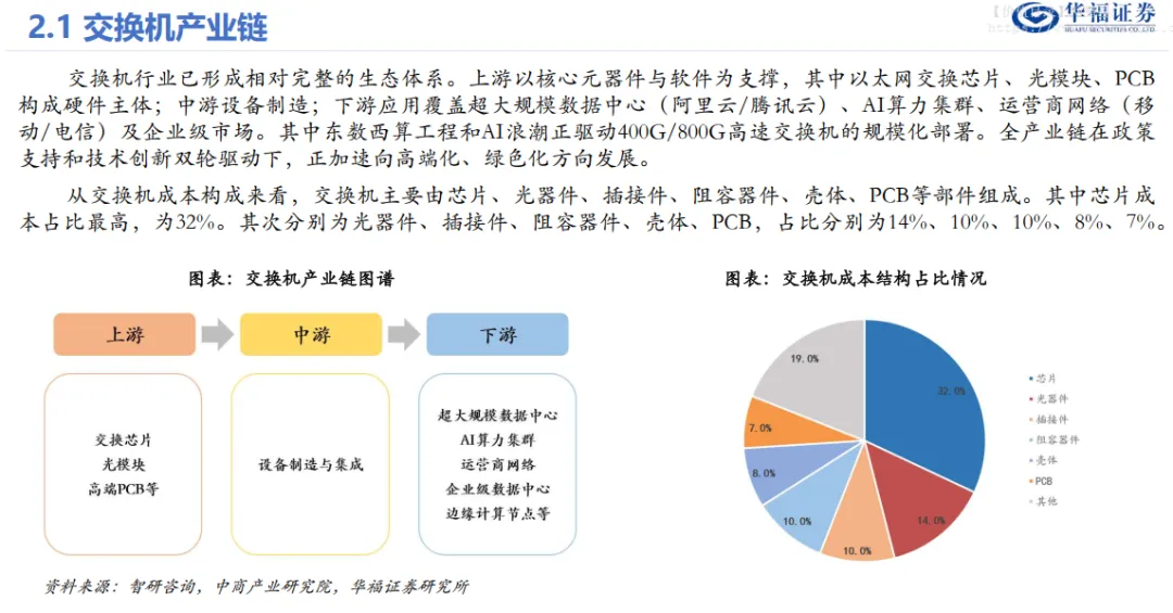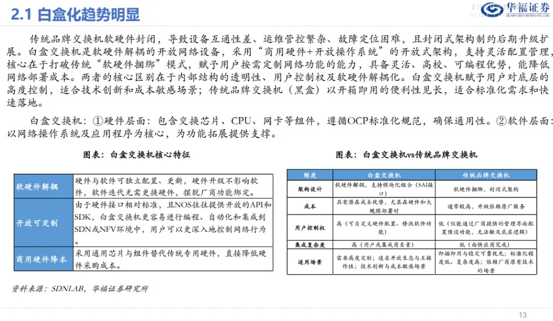 ►交换机需求升级:白盒化、市场扩容、OCS光交换。①白盒交换机是软硬件解耦的开放网络设备,采用“商用硬件+开放操作系统”的开放式架构,支持灵活配置管理,赋予用户按需定制网络功能的能力,具备灵活、高校、可编程优势,能降低网络部署成本。②在AI计算网络中,Scale-Up网络与Scale-Out网络并存,Scale-Up和Scale-Out网络之间的协同作用为当今的AIGC大型模型提供了动力。从十万卡到百万卡集群,AI算力的军备竞赛已驶入深水区。当Scale-Out规模呈指数级扩张,对应交换机的需求也在大幅增长。③OCS交换机建立端到端的纯光物理通道,使其对信号速率、协议和调制格式完全透明,能无缝承载400G至未来1.6T及以上速率的业务,从根本上保证了网络的极致带宽和前瞻兼容性。