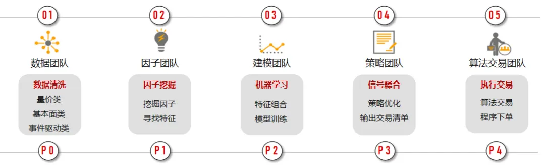 团队细分为数据采集组,特征因子组,建模团队组,组合优化组和交易系统组,实现流水线高效策略迭代。这种专业化分工确保了策略开发的每个环节都能得到深入研究和优化。