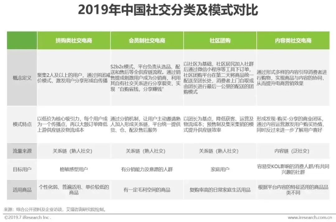 按照流量获取方式和运营模式的不同,目前社交电商可以分为拼购类、会员制、社区团购和内容类四种,其中拼购类、会员制和社区团购均以强社交关系下的熟人网络为基础,通过价格优惠、分销奖励等方式引导用户进行自主传播;内容类社交电商则起源于弱社交关系下的社交社区,通过优质内容与商品形成协同,吸引用户购买。
