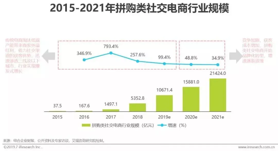 经历近 20 年的高速发展,中国电商行业已从一个初生的婴儿走向成熟的中年,2018 年中国网络购物交易规模 8.0 万亿元,增速逐渐放缓,以天猫、京东、唯品会等为代表的传统主流电商平台用户增速已持续放缓至 20% 甚至更低的水平。无论对于电商平台还是商户,都面临着竞争日益激烈、获客成本不断攀升的困境,亟待找到更高效、低价、粘性更强的流量来源。