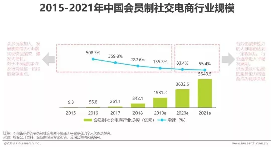2015 年会员制社交电商平台兴起以来,大批微商从业人员的涌入为行业带来了爆发式增长。众多大品牌和传统电商企业看到了这种模式的增长潜力也开始入局进行模式探索,2018 年中国会员制社交电商行业规模达 1010.5 亿元。会员制社交电商平台在发展的早期,强烈依赖通过店主端的裂变与带货能力覆盖更多的消费者,对于小 b 端的争夺与培育将成为这一阶段企业的竞争重点。