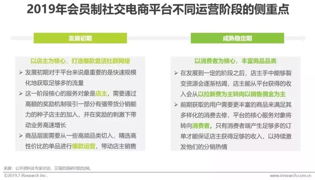 会员制社交电商的平台的运营可以分为两大阶段:在前期通常以快速规模化为目标,通过奖励机制及爆款运营,吸引种子会员的加入并快速裂变。但具有分销意愿和分销能力的人群是有限的,发展到一定阶段之后,店主的拉新裂变能力会逐渐疲劳,进入瓶颈期,店主能从平台获得的收入会从以拉新费为主转向以销售佣金为主。平台需要扩大品类覆盖范围,以优质的供应链与精细化运营来实现业务的持续增长。