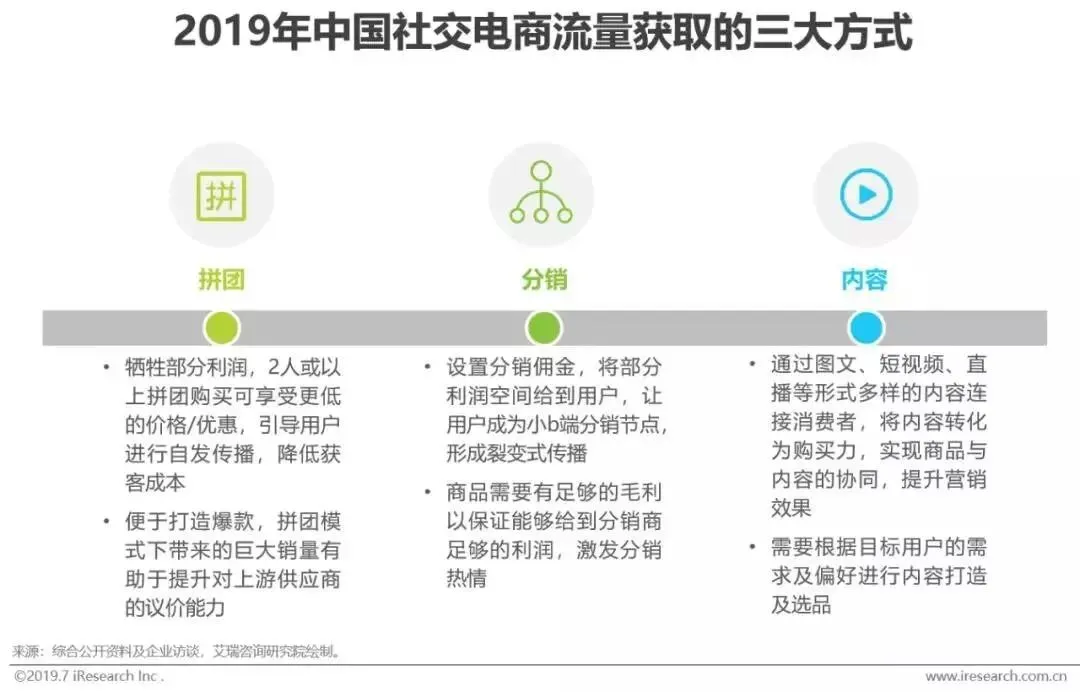 社交电商的快速发展让产业链上下游各方都看到了社交流量的巨大价值,品牌方、商家、电商平台都开始尝试通过多样化的社交化营销方式来降低获客成本、提升用户粘性。拼团、分销和内容都逐渐成为了电商营销的一种常规手段。越来越多的参与者将迅速耗尽社交平台的流量红利,社交流量的投入带来用户增长边际效应将逐步降低。