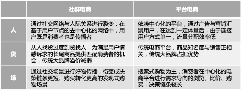 从商家的角度看,传统媒体时代的商家是影响用户消费决策的主导者;进入移动互联网时代后,消费者主动搜索式的购物让商家的影响力有所下降,转为被动;而社群电商帮助实现与消费者的双向连接,让消费者能够保持更长久稳定的关系。