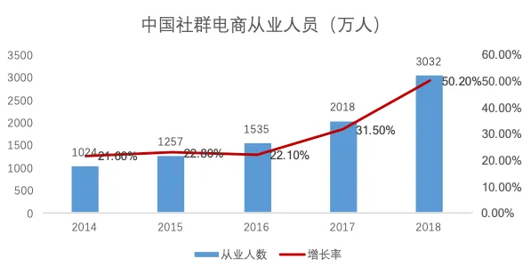 2018年社群电商从业人员(职业化的超级节点包括团长、主播、微商等)达到3000万人,增长率达到50%。