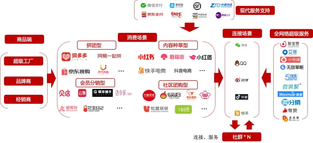 目前社群电商通过内容、分销、裂变等获取用户的方式在以微信为主的社交场景下连接用户,这种单一场景获客产生的用户增长的边际效益将逐步降低,且会在单一场景下形成过度营销的结果。全网络多场景的拓展是未来社群电商的发展方向。