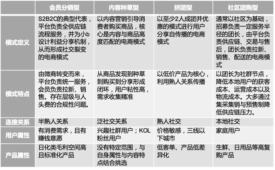 初期社群电商之间竞争要素较为粗暴,是简单的流量逻辑;目前各家之间的竞争不仅仅是用户社群的抢夺,而是转向前中后台的系统化运营,更好地连接社群与产品,更好地赋能小B,提升效率的同时增强节点与社群之间的连接,目前的社群电商主要衍生出了以下几种模式。