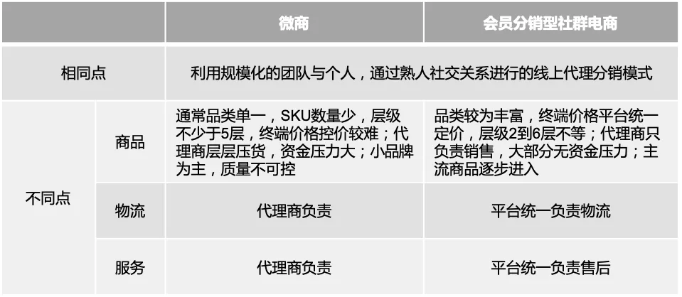 会员分销型社群电商由微商演变而来,继承了微商高渗透率、高触达率的优点,同时社群为会员提供了更多诸如选品、物流、售后、培训等服务,承担更多的售后责任与资金压力,更多的是为了从自购与销售两方面服务好会员。