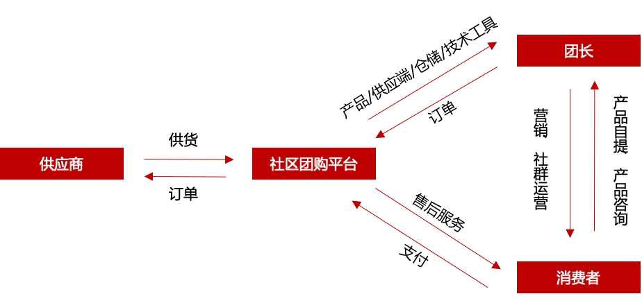 社区团购在模式上与会员分销类似,属于S2B2C的一种衍生,在原有基础上框定了线下地理半径内的服务。社区团购平台提供产品、物流、售后服务;团长一般由社区便利店店主或社区意见领袖担任,负责社群运营、产品推广、销售以及最后500米的配送或者消费者上门自取时的接待服务。